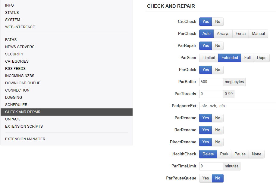 - Dupe — Scan files belonging to the par-set first, then scan other files until repair is possible. Even files from other duplicate downloads are scanned. This can be very time-consuming but brings the best results.