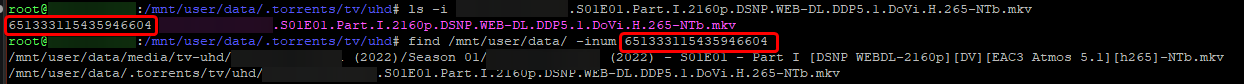 • In your terminal, cd to your download location and run ls -i file.mkv or type ls -i /path/to/your/download/location/file.mkv