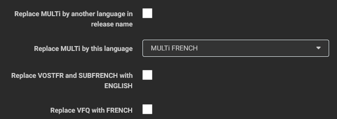 Prowlarr allows MULTi to be replaced by another language. This option is great in theory but will lead to false positives regarding the French audio CFs. Please prefer using the Radarr-specific settings "Indexers - Multi Languages option" below.